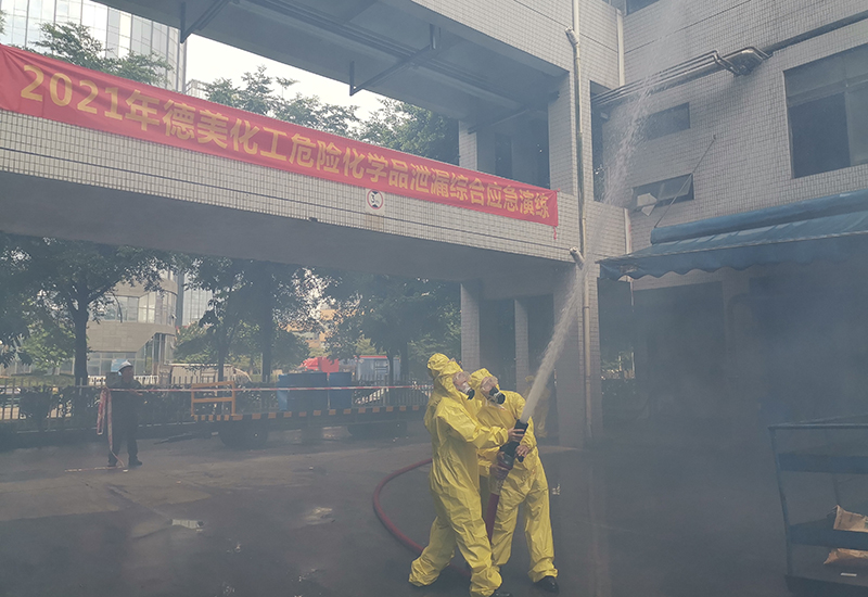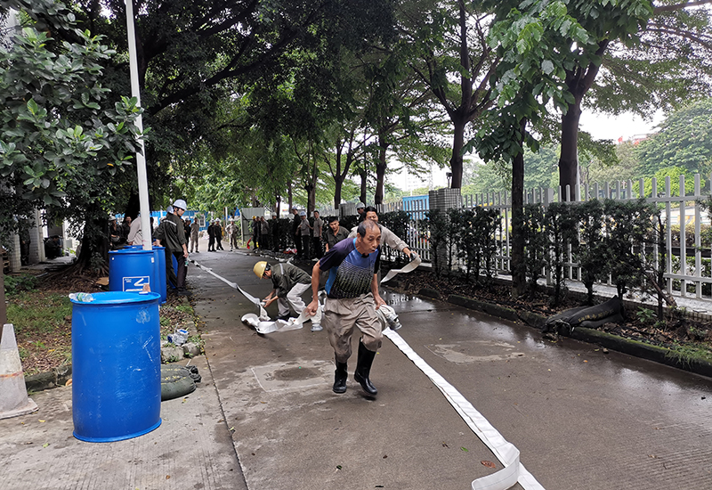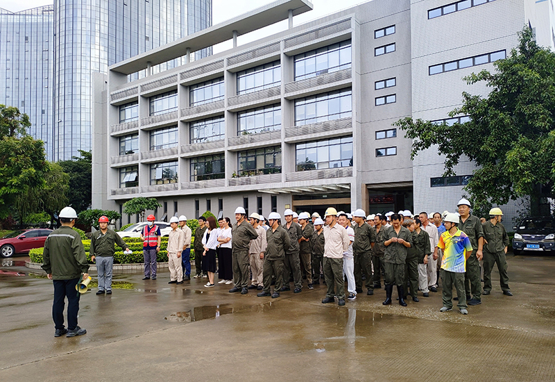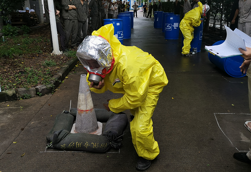 8月14日8點40分,對講傳來“老黃老黃,向小東和普志抽料時發生中毒暈倒了”,生產協助人員立即上班車間領導,隨著車間人員的預警上報,正式拉開了應急演練的序幕??傊笓]張總在接到警情下,啟動了工廠綜合應急預案,通知了控制室和保安室拉響警報,緊急疏散工作人員。各部門人員應聲有序的到指定集合地點集合,各班組保持2米間距,班組負責人立即清點人數,匯報總指揮??傊笓]收到信息后,立即向工廠應急人員下達搶險工作任務。醫療組、警戒組和搶險立即前往消防站穿戴防護用品和救援裝備。同時指揮部領導立即對現場進行指揮救援。搶險組人員將中毒人員轉移到安全區域,醫療組人員對傷員進行緊急救助,開展心肺復蘇術,然后用應急車輛將傷員送往桂洲醫院救治。同時應急搶險組人員立即趕赴事故區域,對泄漏源進行切斷,扶起和轉移包裝桶。然后用應急沙袋對泄漏液進行圍堵和吸附,減少泄漏的揮發和對環境的影響。然后立即連接消防水,采用噴淋槍頭,對車間區域進行灑水,稀釋清除空氣中揮發和殘留的有害原料。灑水結束后,立即對現場開展清凈下水處置,收拾好事故現場,恢復至正常狀態。在15分鐘內完成了整個演練過程的所有工作。