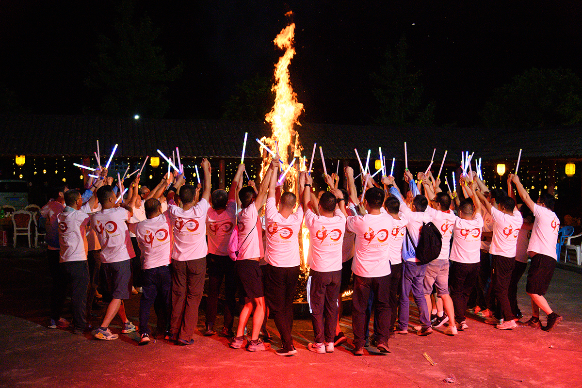 吃過晚飯,本以為活動該結束了,但高潮才剛剛開始,六十幾個人圍成一個大圓圈,中間是一團篝火,動感的音樂,跳舞的小哥激情四射。然后是擊鼓傳花,接到花的人需表演節目,幾輪擊鼓傳花,傳花也越來越復雜,四五只“花”像燙手的山芋在圓圈中飛舞,緊張而熱烈。最終接到花的幾位男同事來到舞臺中央,跳起了笨拙的鋼管舞,笑聲此起彼伏,笑彎了腰,笑疼了肚皮。節目持續到晚上十一點,非凡隊獲得總分第一名,他們打開香檳與大家慶賀,此時煙花四射,將晚會推向了高潮……