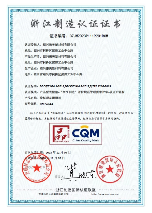 2023年12月4日,經過嚴格的產品檢驗、第三方審查等環節,紹興德美新材料有限公司正式榮獲《浙江制造認證證書》,紹興德美新材料有限公司的產品 “涂料印花增稠劑”成功通過了浙江制造業含金量最高的標準認證,獲得了“品字標”。