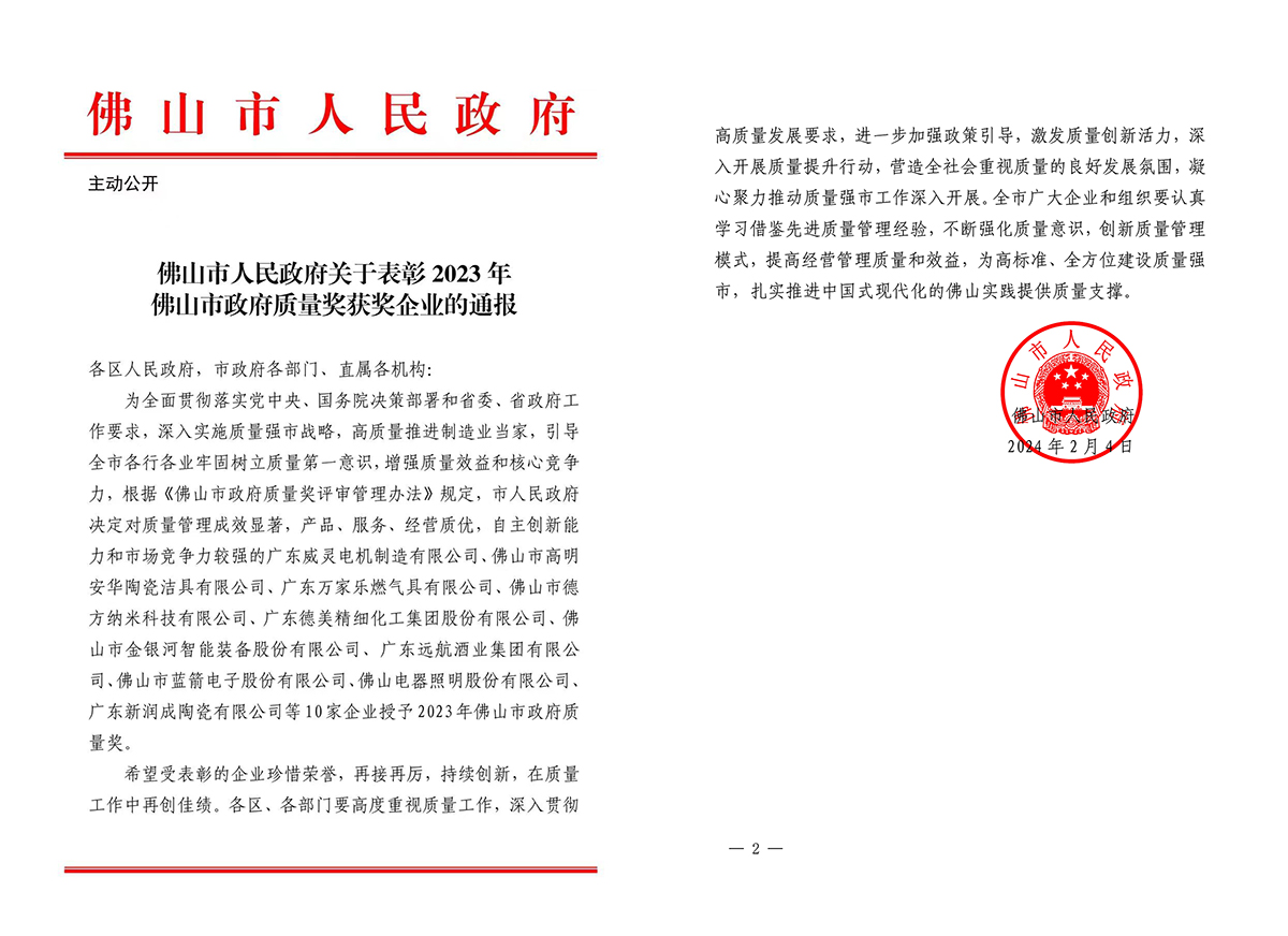 近日,佛山市人民政府發(fā)布關(guān)于表彰2023年佛山市政府質(zhì)量獎獲獎企業(yè)的通報,決定對質(zhì)量管理成效顯著,產(chǎn)品、服務(wù)、經(jīng)營質(zhì)優(yōu),自主創(chuàng)新能力和市場競爭能力較強的10家企業(yè)授予2023年佛山市政府質(zhì)量獎。