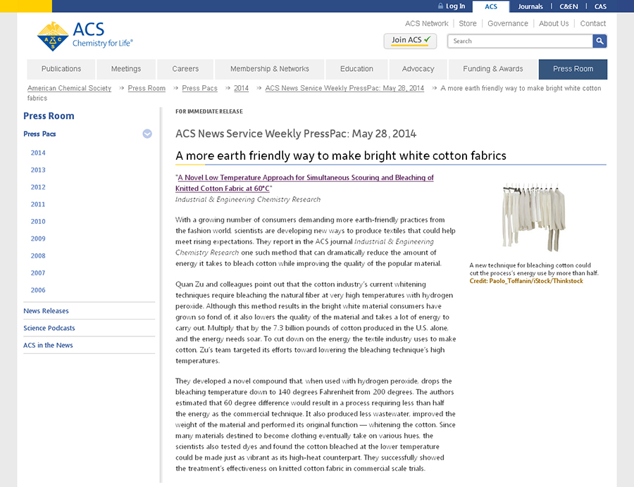 2014年5月28日,在美國化學學會(ACS)的雜志Industrial &Engineering Chemistry Research(IECR)即工業與工程化學研究雜志,發表了我公司有關低溫練漂的研究論文:《A Novel LowTemperature Approach for Simultaneous Scouring and Bleaching of Knitted CottonFabric at 60°C》(一種在60℃對棉針織物同時進行精練和漂白的新型低溫加工工藝),為此,ACS的新聞周刊還專門撰文介紹,題目為“A more earth friendlyway to make bright white cotton fabrics”(一種更加環保的棉織物漂白方法)。